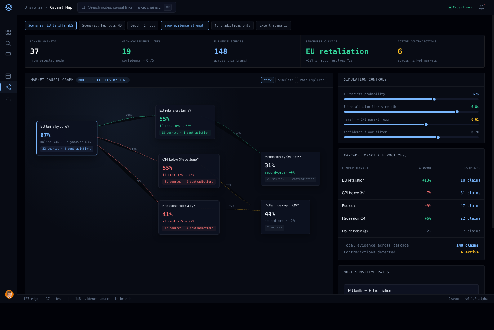 Markets don't move in isolation. When EU tariff odds shift, Fed cut probabilities, recession forecasts, and CPI expectations all move with them. Dravoris maps these cascades so you see the full chain.