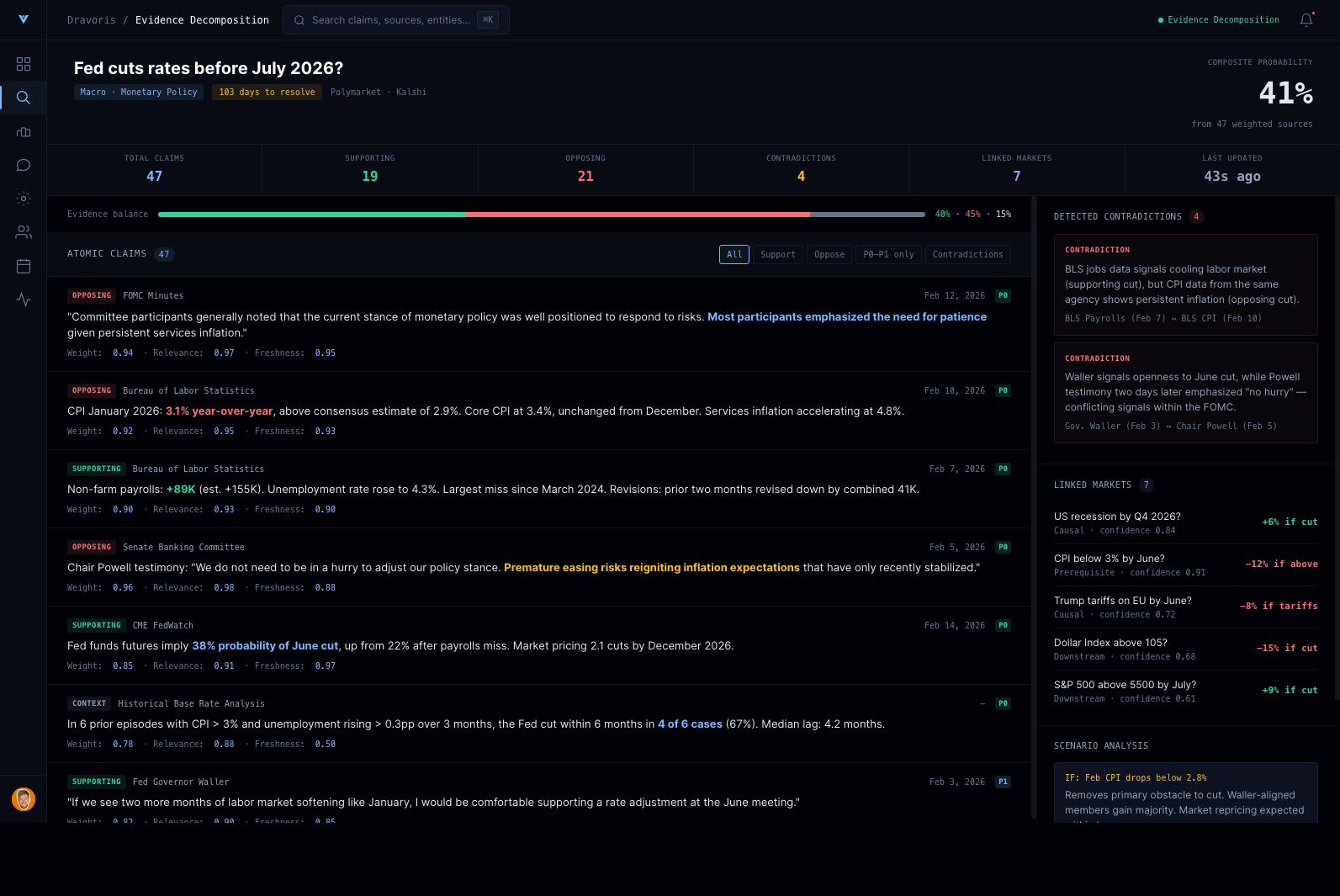 Behind every prediction market is a web of evidence — filings, transcripts, data releases, contradictions — that most analysts never connect. Dravoris connects it for you.